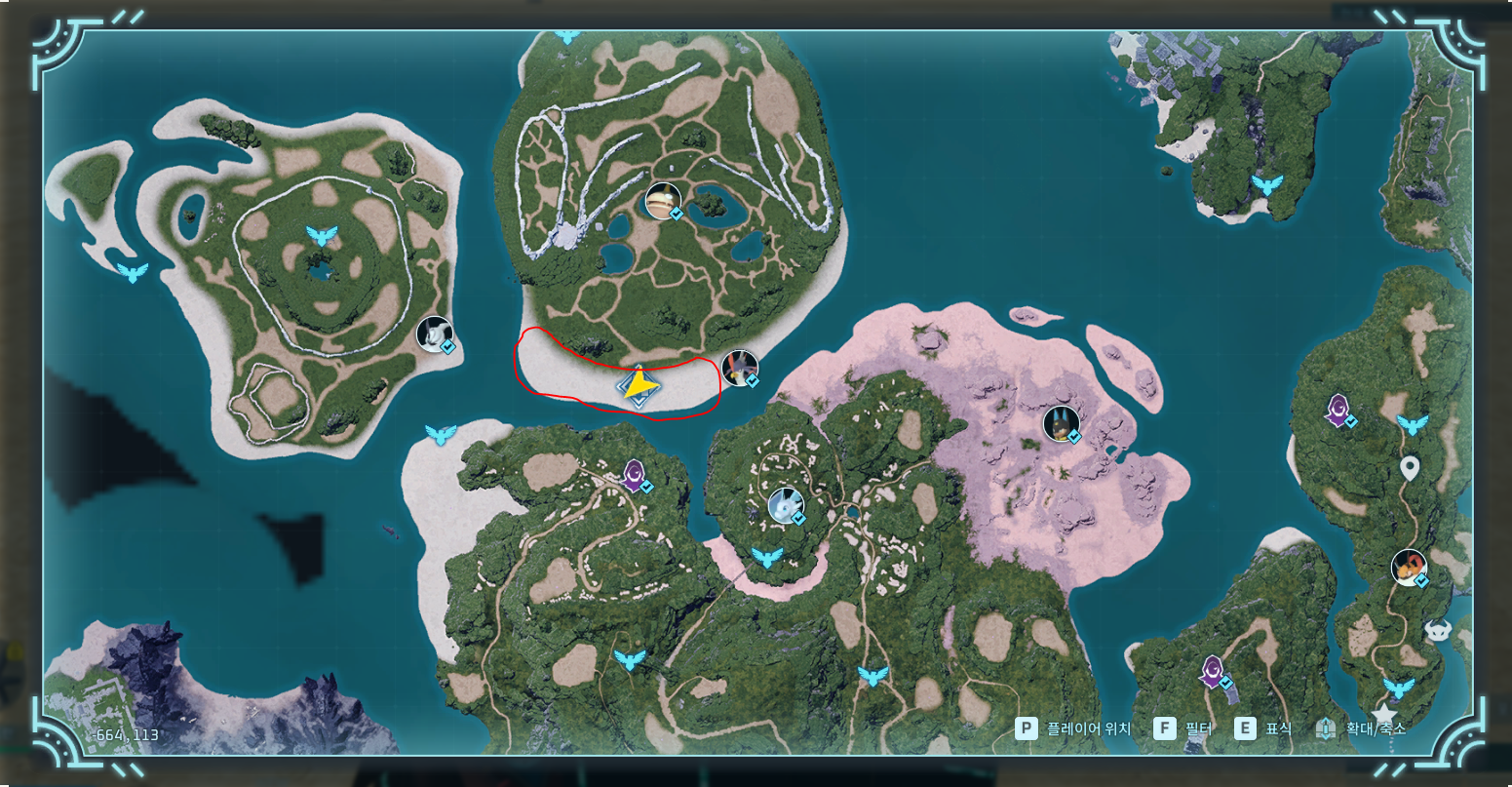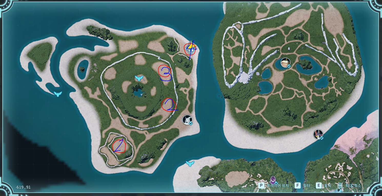 이 섬은 거점으로 쓸만한 곳이 총 4군데 있습니다. 전부 평평하며 걸치는 지형지물이 없습니다. 저도 캡쳐한 곳에 정착하기로 했습니다. 이 글을 쓰기 전에는 이곳에 눈길을 안줘서 이렇게 좋은 거점 후보들이 많은지 몰랐습니다. 이 섬을 둘러 보시면서 거점을 선점하시길 바랍니다. (제가 체크한 4곳은 전부 거점 원이 지형지물에 겹치지 않은 것을 확인하였습니다.)